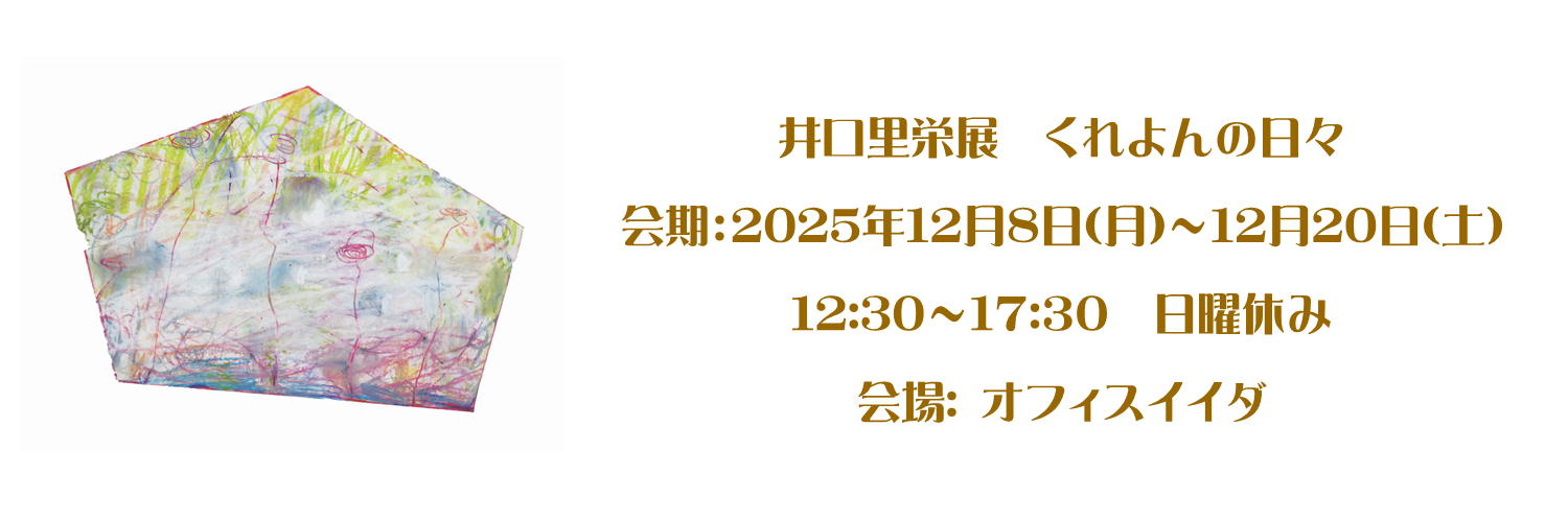 2025年11月15日 / 最終更新日時 : 2025年11月15日 officeiida Exhibition 2025企画│井口里栄展 くれよんの日々 井口里栄展 くれよんの日々 2025年12月8日(月)~12月20日(土) 12時30分~17時30分 日曜休 会場:オフィスイイダ <作家コメント> 日常の中の心に留まる風景や言葉、あるいは記憶の中の出来事が白い紙に現 […]